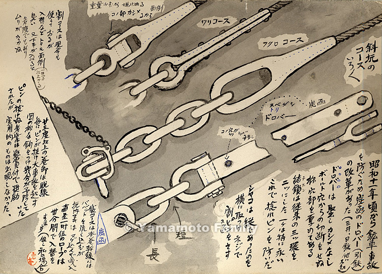 Around 1936, drawbars (hikitetsu) for mine cars were improved in order to prevent mine car accidents from occurring. (I do not know about those used in pits run by Mitsui, Nittetsu and others.)