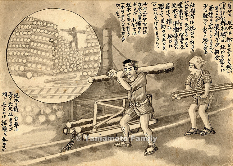 Each pair of repairers called shikurikatas waited at the pit mouth for empty trucks to come and then took one in turn. After informing the warehouse-clerk of the items they needed, they then loaded the truck with mine timbers, and took them to the pit mouth in order to have them sent to the destined level (kanekata) or point. Most middle and large-scale coal pits had stocked timber, but small-scale coal pits often at times did not have any pieces.