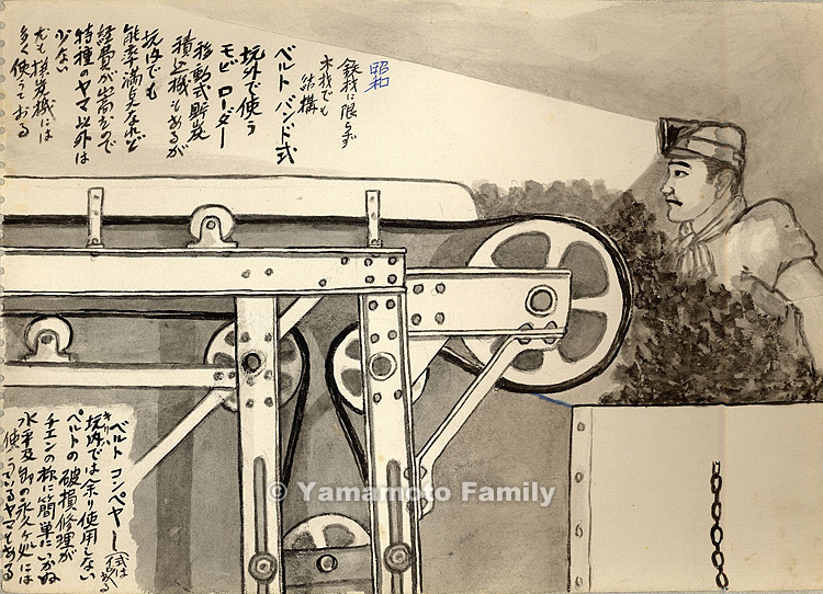 This picture shows a belt-type conveyor in the Showa era (1926-1989). The frame of this conveyor was made not only of steel but also of wood. The mobile coal loader using the conveyor belt was also used on the surface and the machine was very efficient underground as well. However, it was rarely used except in special pits because of the large expense necessary to introduce it, though many mobile coal loaders were used for coal dressing machines.