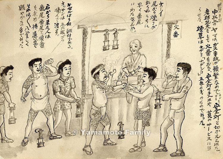 Each of the three pipes prepared were tied to the counter with strings. The old guard handed each miner 5 or 6 pipe bowls of tobacco at one time. Those who came to the guard house later could not wait their turn long and demanded others to quickly pass the pipes to them, shouting very loudly, "Banjiri! Banjiri! (Pass the pipes to the end of the line quickly!)," so the guard house was very busy and noisy.