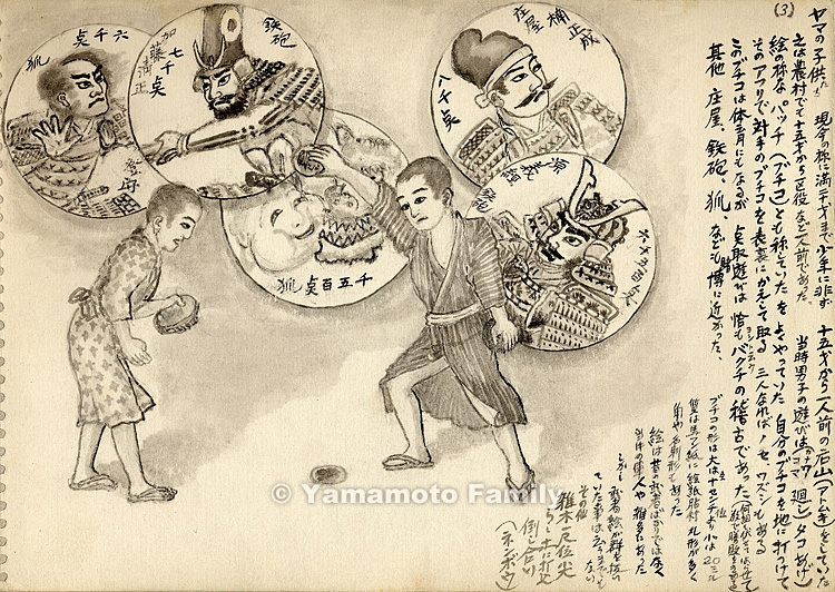 Boys in coal pits in the old days were regarded as adults earlier than today's boys who are regarded as adults after they become 20 years old. Every boy worked as a full-fledged helper called an atoyama (atomuki) of the coal hewer (sakiyama) after he became 15 years old. Boys in farm villages also worked as full-fledged laborers after they became 15 years old. Boys at that time mainly enjoyed top spinning (with tops with an iron ring), kite flying, and patchi (buchiko: pog) as shown in this picture. In patchi, a player flung one of his buchiko cards on the ground to turn over the opponent's one by causing a slight wind and take it. When three boys played with the patchi cards, they also played games called nose and wazushi. These buchiko games were also useful for physical training. However, the score-keeping game with these cards was just like the training in a gambling game called yoshi, in which some combinations of hanafuda cards were laid on their faces to let gamblers bet on them and the outcome was decided by the scores shown by the cards. Other buchiko games called shoya, teppo, and kitsune also resembled gambling games.