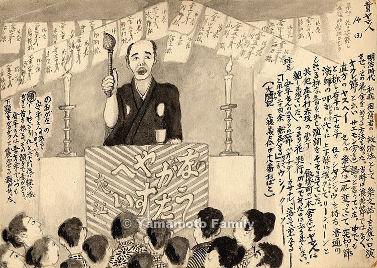 (His specialties were a story of Hideyoshi Toyotomi, Taikoki and a story of the forty-seven loyal samurai, Ako Gishi Den.)