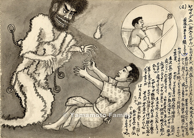 According to an old saying, no one can stop a villain from doing evil when he is strong, but he must pay for doing wrong someday. The evil man was destined to be put to the sword. The most villainous man Wazo was slain by a young man whom he had bullied. One summer night, the young 19-year-old man stabbed him to death with a Japanese sword when Wazo flopped down on his knees, wrapped in his mosquito net, whose hangers had been cut off by the murderer while Wazo was fast asleep. The young man was arrested for murder and sent to the house of detention in Fukuoka later. However, Wazo's implacable ghost haunted his cell every night and tortured him. He writhed in agony at night, crying many times that Wazo came to him. He went insane and died while pending trial after wasting away day by day.