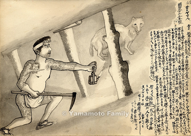 I still cannot forget the mining sounds made by the raccoon dog, which I heard in the night when I entered the pit with my father during the summer holidays as a boy. An old miner said that the mining sounds fabricated by the raccoon dog lacked the sound of a pickax being dragged and that the sounds that resembled a moving mine car lacked the creaking sound between the rails and wheels or the clinking sound made by swinging coupling chains (chain hangers were not used in the past). In some regions, the raccoon dog was called an anaguma (badger), which is a little different from the raccoon dog and its skin was used as the packing for bellows, or an ujina (mujina). It sounds strange and ridiculous that this raccoon dog deceives and fools people. However, there is no doubt that it is true because these descriptions were based on realities in the past.