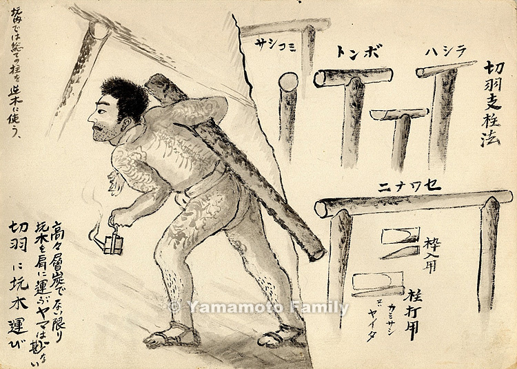 The miner is carrying a timber to his coalface. Except for coal pits with extremely thick coal beds, there were few coal pits in which miners were able to carry their timber on their shoulder.
