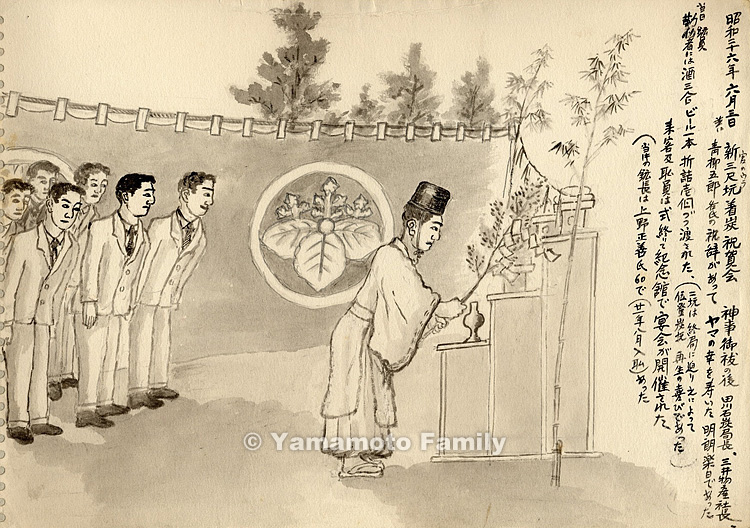 The people in the pit prayed to the pit deity for the fortune of the pit on this fine and happy holiday, receiving congratulatory addresses from the director of the Tagawa Coal Bureau, the president of Mitsui & Co., Ltd., and Mr. Goro Aoyagi after the purification by a Shinto priest.