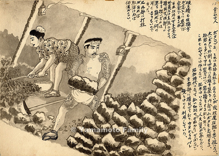 This rock cribbing was not built in small coal pits. No timber was needed in building it, but great cost was required to hire workers to do it. In the beginning of the Showa era (1926-1989), the cribbing was constructed at important points in pits, such as the boundary between long wall workings and levels (kanekata). It was also served as a receiver of falling debris called bare-bota from the inclined side (kata) of slopes.