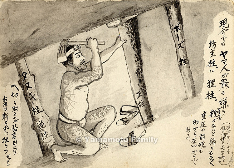The right and left pillars are bozu-bashira (pillar with no wedge on it) and tanuki-bashira (raccoon dog taking the form of a pillar, i.e. the pillar stood topside up with no wedge on it) respectively, which miners still hate the most today. It is because these pillars do not stand firmly and miners cannot notice the warnings of roof falls without the wedges on the pillars. (Today miners at some pits sharpen the feet of the pillars used at points where the bottoms of the roadways are soft.)