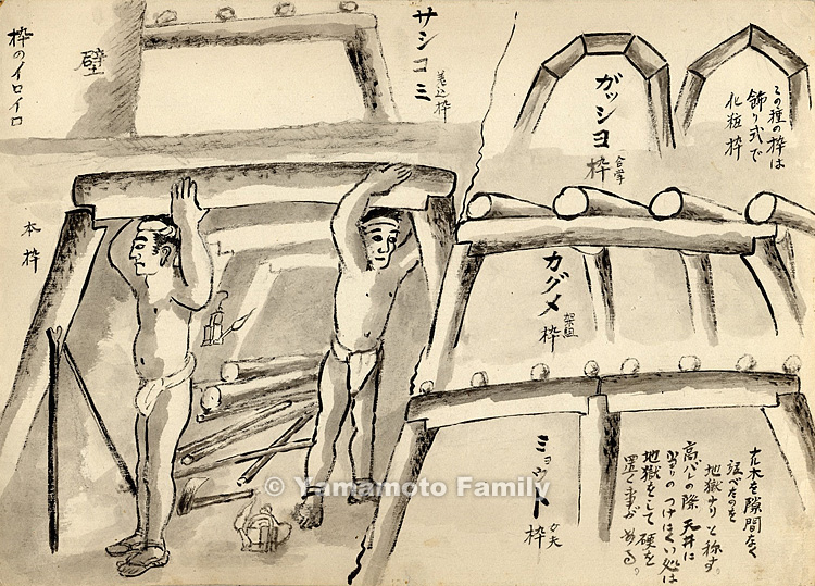 Lagging (narugi) which was densely laid almost without gaps was called jigoku-nari. When the roof of a roadway became higher than before and difficult to support after a roof fall, repairers sometimes laid lagging like this and put rocks on top.