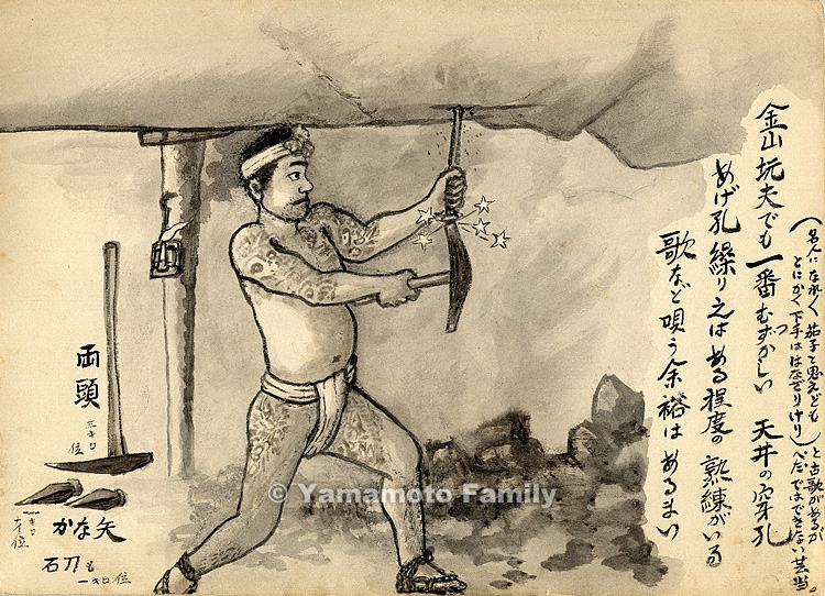 The shown work of drilling a blast hole in the roof was called ageana-kuri and it was the most difficult work for even a kanayama kofu (miner from Besshi Copper Mine, whose skill was thought to be best among the miners in the pit). This work required skill to some extent and I suppose the miners doing this work had to concentrate on it without singing songs.