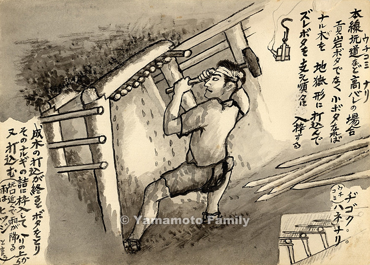 After driving the lagging, the repairer removed the refuse on it and inserted a support unit into the gap between the lagging and the roof, again driving other lagging from above the beam. (Drops of water fell from the roof near the pit mouth and they were called hitsuji.)