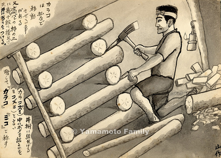This painting shows cribbing made of mine timber called kara-kozumi arranged in parallel crosses, and the same cribbing filled with refuse was called mi-kozumi (filled cribbing). The above two kinds of cribbing were also called "karako"' and "miko'' for short respectively.