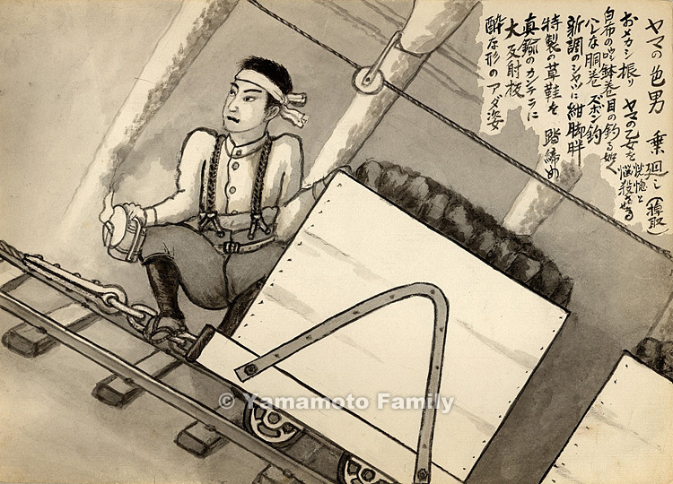 The mine car driver was so smartly dressed that young girls in the pit were enchanted by him. He wore a white headband with its knot behind to lift up both of the outer corners of his eyes, a flashy wide stomach band and suspenders, a newly-tailored white shirt, a pair of dark blue gaiters, specially made straw sandals, as well as held a brass lantern with a large reflector. He looked really stylish and seductive.