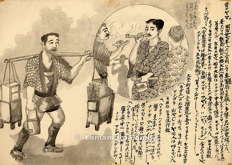 In August of 1904, tobacco was monopolized by the government and the newly established Monopoly Bureau released many kinds of tobacco. They sold cigarettes, such as Shikishima (10 sen: 0.1 yen), Asahi (8 sen: 0.08 yen), Yamazakura, Yamato, (as well as a high-grade cigarette, Kokka later), Camellia and Golden Bat (5 sen: 0.05 yen), etc. (The Homare was supplied only for the Military.) However, the people at that time including pit workers liked to smoke shredded tobacco very much out of fear of nicotine addiction. Therefore, smokers made it a habit to spend a lot of money on smoking pipes or tobacco cases and boasted about them. A popular song at that time called Rappa Bushi goes as follows: