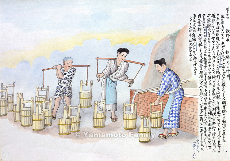 When K Coal Pit run by Mr. A was opened in 1895, water came out of the surface of the cut mountain, and the spring water supported the life of the people (yamabito) in the pit. There were no wells near the pit (yama) and no water came out if miners bore holes in the ground. Though there was a well in a mountain covered with Japanese cedars at the border between a village and the pit, it was as far as 1 kilometer away from the pit and its water was not good to drink because of the amount of iron contained in it. But then again, though the above spring supplied enough to support all the people in the pit during the rainy season, during the dry season it trickled out like the urination of a horse. So, the people in the pit used the water as carefully as eye lotion, so as not to waste it. They lined the road to the spring with pails (tago) and filled them with the spring water in turn. Each family used a pair (ikka) or three pails (ikka-han) of water a day. Sometimes in summer, they had to wet pails to prevent them from drying up and warping. It was a struggle to soak pails with water.