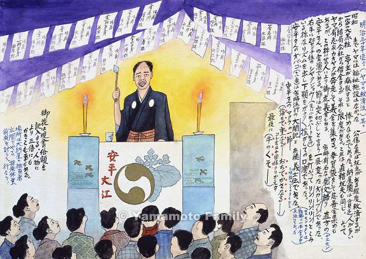 This painting shows a performance by the famous saimon-katari popular reciter, Mr. Saemon Yasuhei from Nogata. He recited stories in an odd singsong tone called okare bushi but also called tsukkiri bushi. During his performance, he trembled his lower jaw, and shook a shakujo (an about 20-cm-long metal stick with a heart-shaped moving head in his right hand) to make deeply moving touching ringing sounds. His specialties were Taikoki (a story of one of the Japanese conquerors in the 16th century, Hideyoshi Toyotomi) and Ako Gishi Den (a story of the forty-seven loyal samurai of the Ako Clan) which were popular at that time. Also a shamisen (three-stringed banjo-like instrument) player supported him. There were other saimon-katari popular reciters, such as Ipponsha in Iizuka and one in Akasaka.