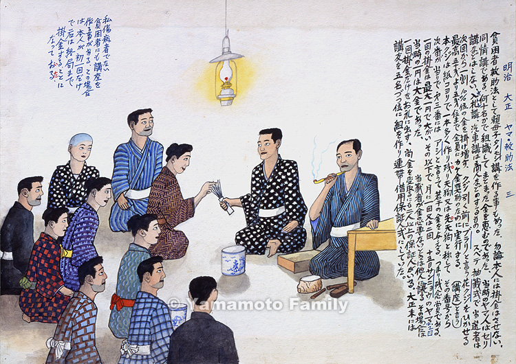 The mutual financing association (ko) called a tanomoshiko was sometimes organized in the coal pit for helping the poor. Of course the insurance premium was not charged to them. It was a mutual financing association based on compassion for the poor. The association was organized by some groups of people and it loaned some money to those in need. The pit workers at that time did not use any mutual financing associations that loaned money by bidding (seriko). Such an association called otoshiko or kishako was for merchants. Every loan was given to the winner of the draw and the winner paid 10 percent higher monthly premium from the next payment. To raise more money before the draw, the representatives made the members draw a special lot called a burari, which caused them to pay additional 5 sen to 50 sen into the pot.
