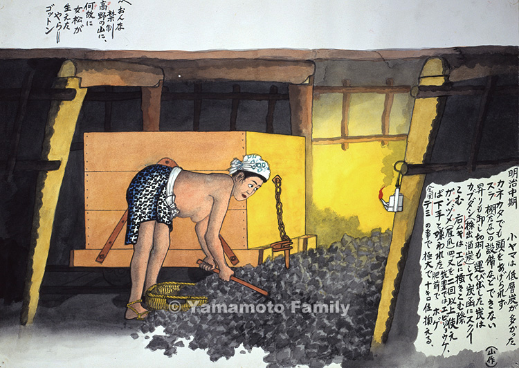 Most small-scale coal pits in the mid-Meiji era (1868-1912) had thin coal beds. The pit workers at such pits could not lift their heads or build any platforms for dumping coal sleds (sura) even in levels (kanekata). The coal carried out from both ascending and descending coalfaces was temporarily dumped and stored (kabudashi) at some places before being scooped up into mine cars. The hewer's helper (atomuki) who needed to use his/her four-blade rake (ganzume) more than one time in scraping coal to fill a bamboo winnow (ebi) was disliked as unskilled.