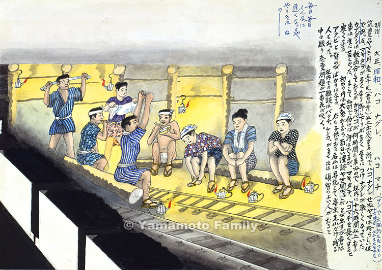 In the beginning of a hako nagure, lots of workers were waiting and they could enjoy chatting or gossiping, but after some time all they could do was yawn and stretch their arms. However, some female atoyamas (helpers) with children would often leave their husbands as sakiyamas (hewers) behind to exit the pit earlier.
