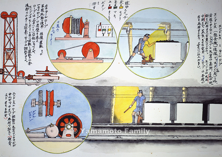 The two insets on the right show the tail rope used in a slope with a single track. In this case, mine cars were wound up and down. Therefore, one side of the rope ran along the wall on the inclined side (katakabe) of the slope. The rope used here was a 5/8-inch-thick (16-mm-thick) zinc wire rope. The wire rope drum rotated together with the motor, and no operator was required. The tension of the wire rope was adjusted by moving the smaller sheave wheel (magoguruma) behind the wire rope drum.