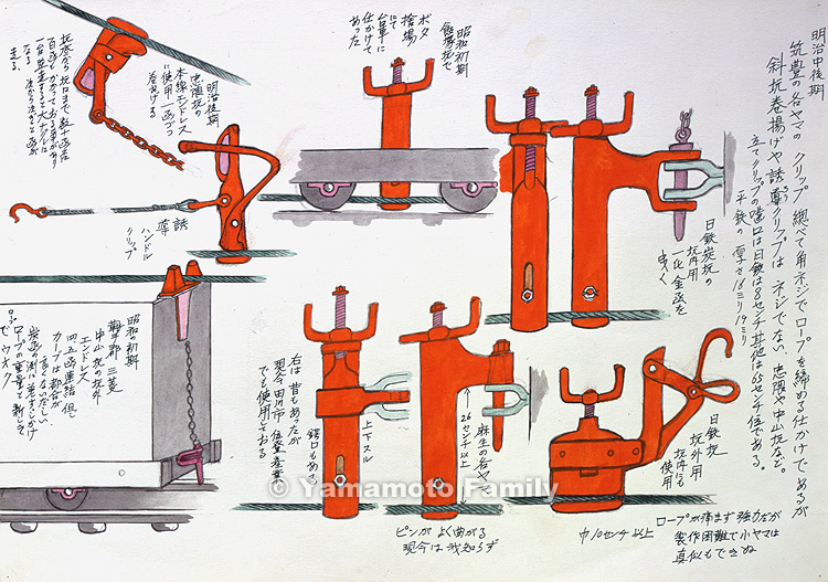 All these clips were attached to wire ropes with square threads, except certain ones used for winching up mine cars in main slopes or guiding them at Tadakuma Coal Pit, Nakayama Coal Pit, etc.