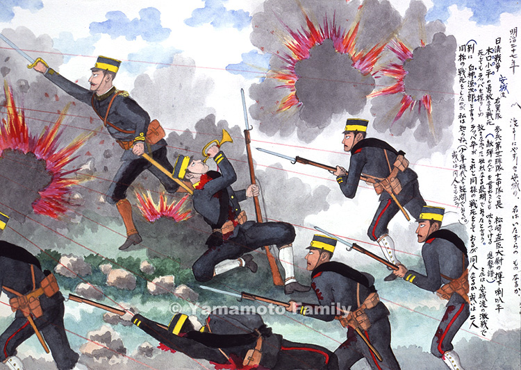 A bugler Kohei Kiguchi met a noble death in Anseong, Korea. He had fought under Captain Naoomi Matsuzaki of the 12th Company of the 21st Infantry Regiment which was on the right of the striking force. (He had got a gunshot wound through his neck, but he kept on making bugle calls for marching until he died.) He had held on to his bugle even when he was dead. It was said that he met a heroic death. This picture shows the fierce battle at Anjo Watashi (Crossing Site of the Anseong River).