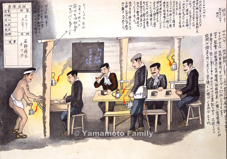 This painting shows a sasabeya which originated in the Meiji era (1868-1912). It is in the days when oil lamps were used underground.
