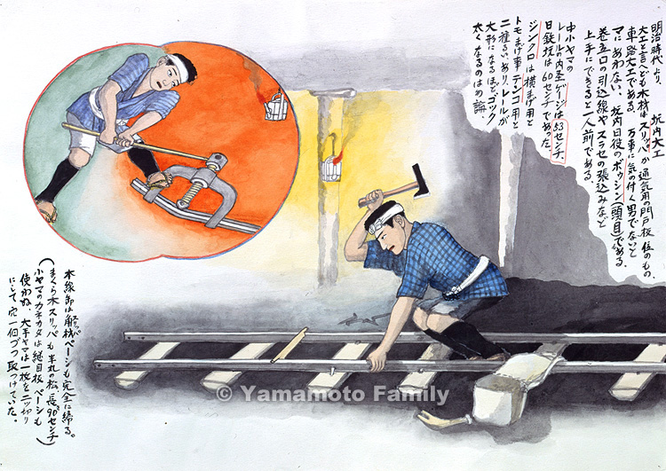 Though this worker was called a carpenter, he used timber only for ties (sleepers), or wooden air gates. He was also called a track-layer, who needed to be quick and perceptive of his surroundings to do this job. He was the boshin (supervisor) of underground day-laborers. He was considered a full-fledged underground carpenter when he became good at laying turnouts in makitates (the entrance from the slope to the level) or curved tracks with surases (guide rails and rollers).