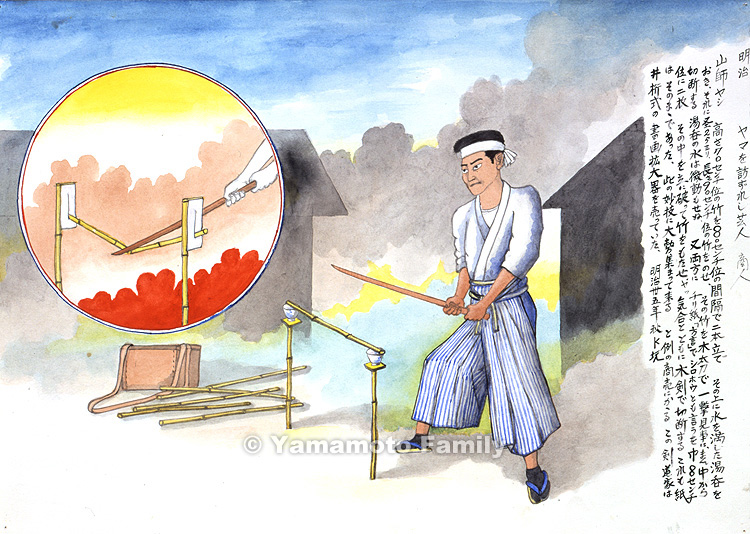 Additionally, he hung a piece of eight-centimeter-wide toilet paper or chirigami (also dialectically called shiroho) from a crosspiece on top of each of the two bamboo sticks. He made a slit in both pieces of the paper and put each end of a new bamboo stick into the slits so that the stick was held with the paper. Then he yelled and cut the stick with the wooden sword. Also in this case, the paper was not broken. When large crowds gathered around him to see these splendid performances, he started to sell his goods as usual. This kendo fencer sold parallel-crossed enlargers for letters and pictures. It was in the autumn of 1902 that he visited K Coal Pit.