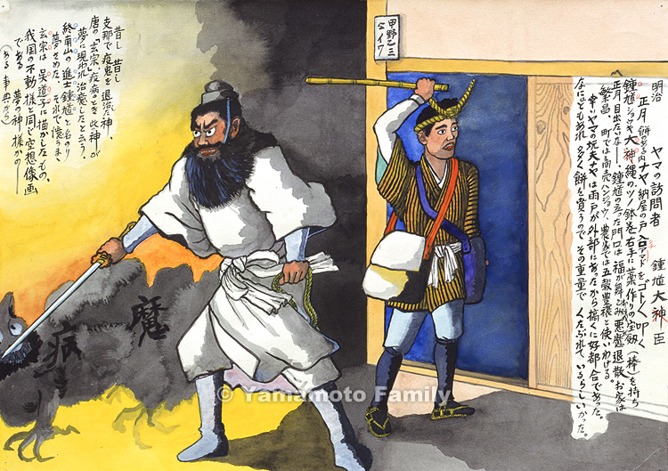Shoki is the god who defeated the demon of ill health in China a long time ago. It is said that when Emperor Xuan Zong of the Tang dynasty suffered from a plague, this god appeared in the emperor's dream and cured his disease. The emperor woke up after hearing from the god that his name was Shoki and that he was a Chinese civil servant in Mt. Zhongnan Shan. Therefore, the shown figure of Shoki on the left is based on the picture painted at the emperor's order by a Taoist called Wu. The painting is an imaginary picture painted in the same way as Fudo-sama (Fudo Myoo: Acala the god of fire) in our country. It can be said that he is a god in a dream. (This paragraph is based on the description of an encyclopedia.)