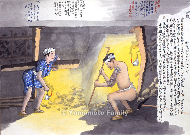 Hard shale roofs in the pit (yama) did not fall (barenai) easily. However, increasing rock pressure strained the whole pit. Therefore, the bottoms of slopes and levels swelled while the walls on the inclined sides (katakabe) collapsed (kayaru). In order to equalize and smooth out the railway tracks, the floor, of which some parts had become swollen by rock pressure, was lowered (kujirisage). The repairer drove new pillars along the fallen walls. He also fixed thin lagging (narugi) on the pillars to make fences between them. At points where pillar legs were stood, the floor was dug as deep as more than 10 centimeters. If not, the pillars standing directly on the floor sometimes popped out when rock pressure increased, and fell down on miners.
