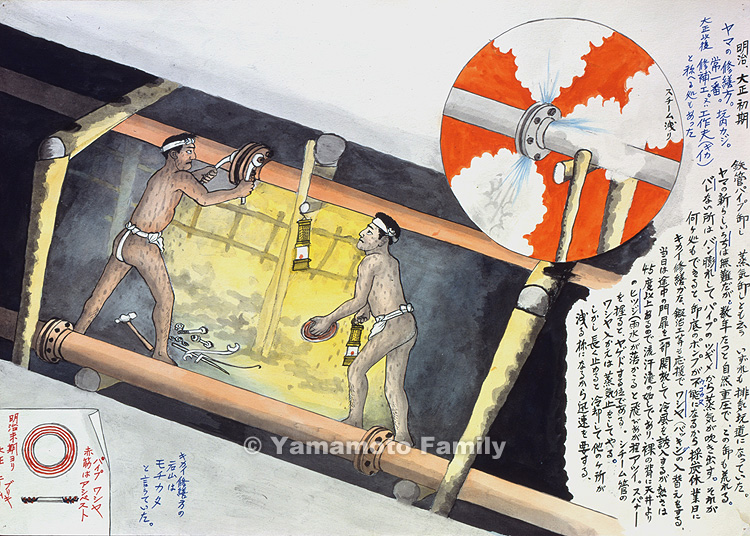 Slopes called paipu oroshi (slopes with iron pipes) were also called joki oroshi (slopes with steam pipes), and all of them were used as return air ways. When coal mines were new, these slopes were acceptable, but after a few years, every slope got ruined by rock pressure. Where roof falls did not occur, roofs and bottoms would become swollen and cause steam leaks from joints between pipes. If such defective joints increased in number, the steam-engine pump at the pit bottom stopped. On coal mine holidays, repair men, smiths and other helpers worked together to change the old broken washers for new ones. Even though some air gates along the way were opened to get cold air on that day, the ambient temperature reached 45 degrees Celsius or more, and the workers sweated from every pore. When drops of water (hitsuji) dripped down on their bare backs from the roof, the water was so hot that it terribly astonished the repairers. Their spanners became hot enough to scald their hands. Before the washers of the steam pipes could be replaced, the steam had to be stopped. But if the stop took a long time, pipes cooled down and could cause other leaks, requiring immediate repair by the workers.