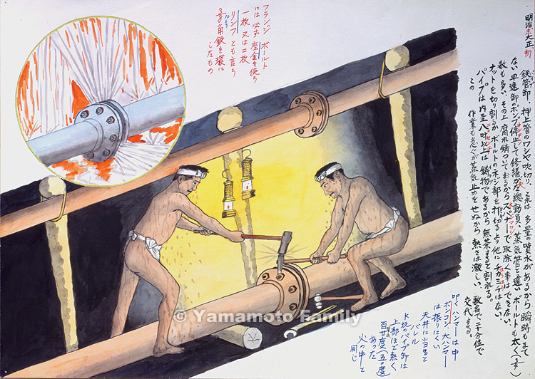 A medium-sized hammer called a bonkoshi was used to hit another smaller one on the nut. A large-sized hammer was difficult to swing and it might cause a collapse if it hit the roof of the slope. It became hotter as miners ascended the slope with iron pipes in K Coal Pit and the temperature reached 120 degrees Fahrenheit (50 degrees Celsius). It was as hot as if they were in a fire.