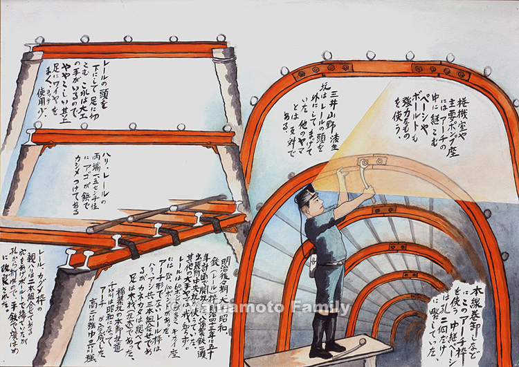These steel (rail) frames were used at the end of the Meiji, Taisho, and Showa eras. They were used at the Central Coal Pit of Futase Branch of Yahata Ironworks, which was opened in 1910 according to the company's 50-year plan. I do not know if they were used at other large-scale coal pits. Most rails used at this pit were 60 pounds per yard. 75 or 100-pounds-per-yard rails were also used for frames supporting the roofs of machine stations. Frames using straight rails were composed of three parts of a beam and two pillars, and all frames used in levels had timber pillars. The arched frames supporting the 1,000-meter-long main slope of Inatsuki Coal Pit were completed in the beginning of the Showa era. These frames were a little more than 2 meters and 3 meters in height and width respectively.