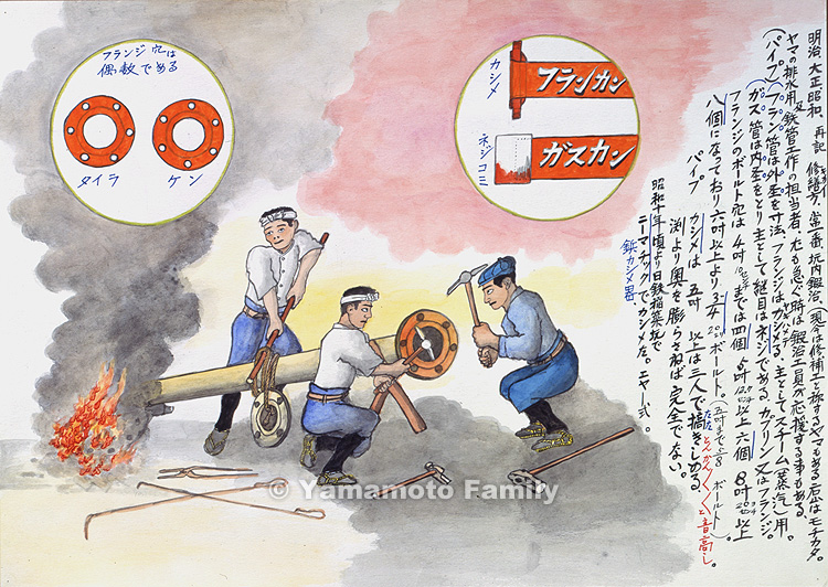 At Nittetsu Inatsuki Coal Pit, flanges were fixed to pipes by caulking with a pneumatic riveting machine moved by air.