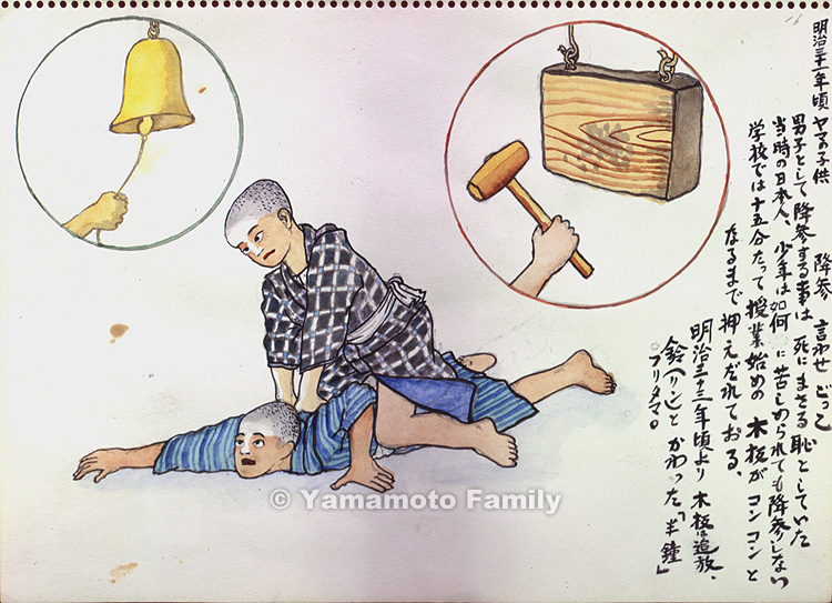 Boys considered admitting defeat to be a shame more intolerable than death. Japanese men or boys at that time would not surrender no matter how hard they were tortured. The boy pinned against the ground never gave up until the wooden gong was struck to announce the beginning of the class after a 15 minutes' break at school.