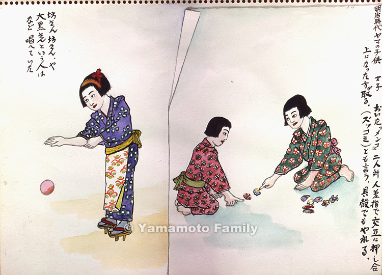 The girl bounced a ball, chanting, "Bo-san (Mr. Priest)! Bo-san!" or "Daikoku-san to yu hito wa... (The man called Mr. Daikoku...)"