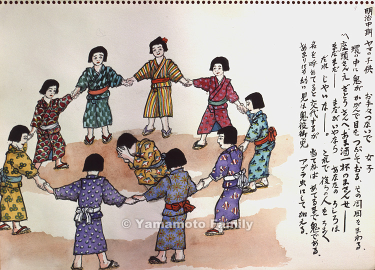 If she could successfully guess who was behind her, the girl whose name was guessed had to be the next "it." However, the girl in the middle could not change roles with anyone for a long time if she could not guess the name of the girl behind her. Very young girls could not be "it," could join the game as obligation-free members called aburamushis (aphids or cockroaches).