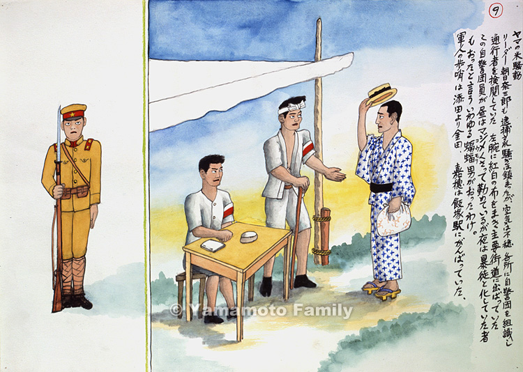The ringleader who took a false name of Saburo Asahina [name of a famous samurai in the Kamakura period (1192-1333)] was arrested and the riots ceased. After the dust settled, there was still a restless atmosphere. People formed vigilante groups (jikeidan) everywhere. They tied a red and white armband around their left arm, and conducted security checks on main roads, inspecting every passerby. These vigilantes earnestly worked in the daytime, but some of them turned into mobs at night. They were like Dr. Jekyll and Mr. Hyde.