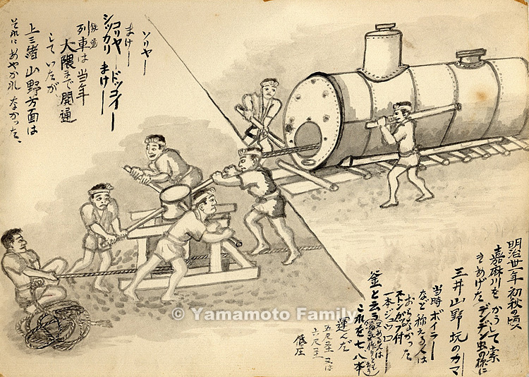当時ボイラーなど称える人はおらなかった。ストンガップ付。一本ジュウロー釜と云う(又、ある人は湯気作りとも云う)。これを七、八本運んだ。五尺径又は六尺径、低圧。