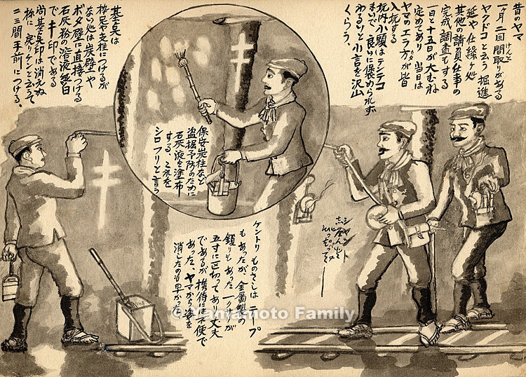 基点は枠足や支柱につけるが、ない処は炭壁やボタ壁に直接つける。石灰粉の溶液純白でキ印である。尚、基点印は消えぬ様に戻りケンと云うて二、三間手前につける。
