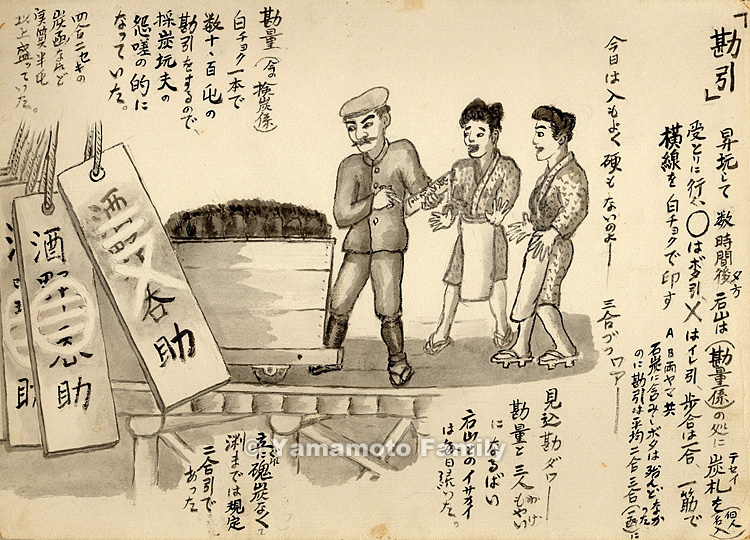 昇坑して数時間後 夕方 后山は(勘量係)の処に炭札(テセイ)を(個人名入)受とりに行く。○はボタ引 ×はイレ引、歩合は一合、一筋で横線を白チョクで印す