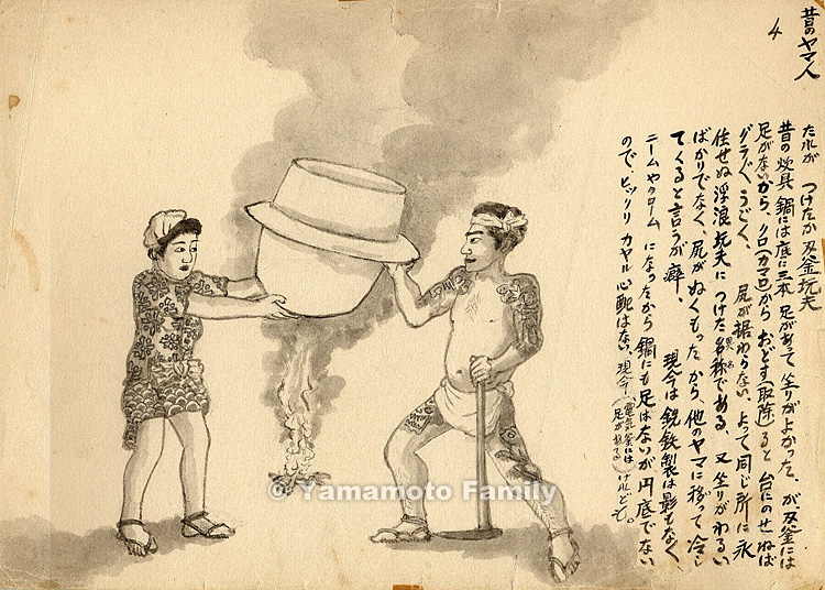 現今は銑鉄製は影もなく、二(ュ)ームやクロームになったから鍋にも足はないが、円底でないのでヒックリカヤル心配はない。現今、電気釜には足があるけれども。