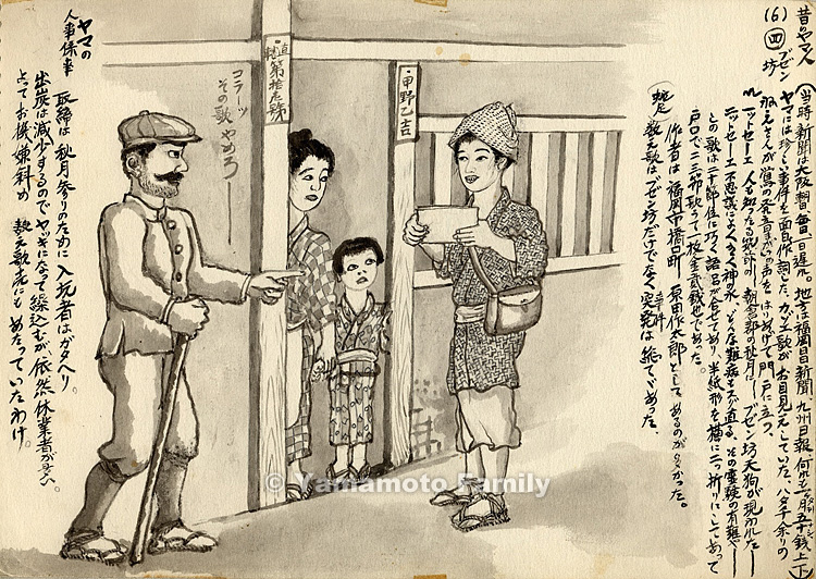 この歌は二十節位に巧く語呂が合わせてあり、半紙形を横に二つ折りにしてあって、戸口で二、三節歌うて一枚金貮銭也であった。作者は福岡市橋口町、原田作太郎としてあるのが多かった。