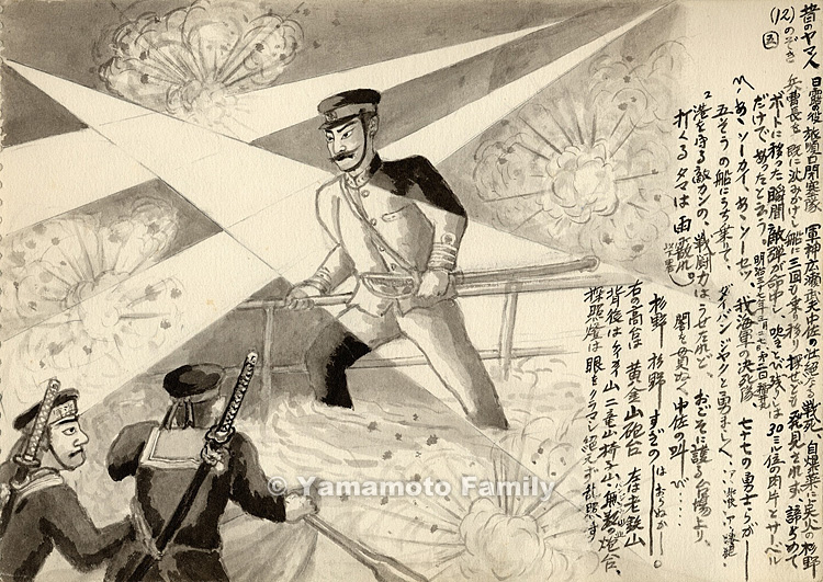 旅順口閉塞隊、軍神広瀬武夫中佐の壮絶なる戦死。自爆薬に点火の杉野兵曹長を既に沈みかけし船に三回も乗り移り、探せども発見されず、諦めてボートに移った瞬間敵弾が命中し、吹きとび残りしは三〇ミリ位の肉片とサーベルだけであったと云う。明治三十七年三月二七日、第二福井丸。