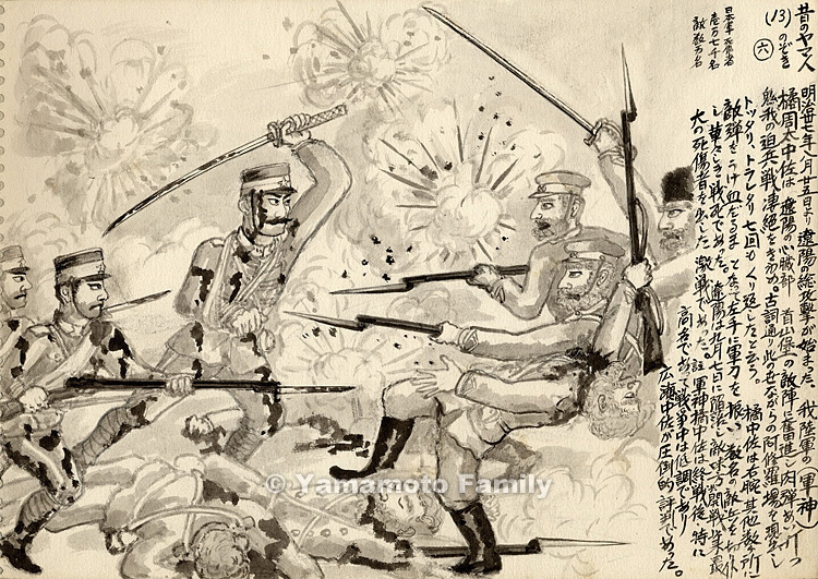 明治丗七年八月廿五日より遼陽の総攻撃が始まった。我陸軍の(軍神)橘周太中佐は遼陽の心臓部 首山堡の敵陣に奮進し肉弾あい打つ鬼我の迫兵戦凄絶をきわめ。古詞通り此の世ながらの阿修羅場を現出しトッタリ、トラレタリ七回もくり返したと云う。橘中佐は右腕其他数ヶ所に敵弾をうけ血だるまとなって左手に軍刀を振い 数名の敵兵を切り仆し華々しき戦死であった。遼陽は九月七日に陥落し敵味方共開戦以来最大の死傷者を出した激戦であった。註軍神橘中佐は終戦後、特に高名であって戦争中は低調であり広瀬中佐が圧倒的評判であった。