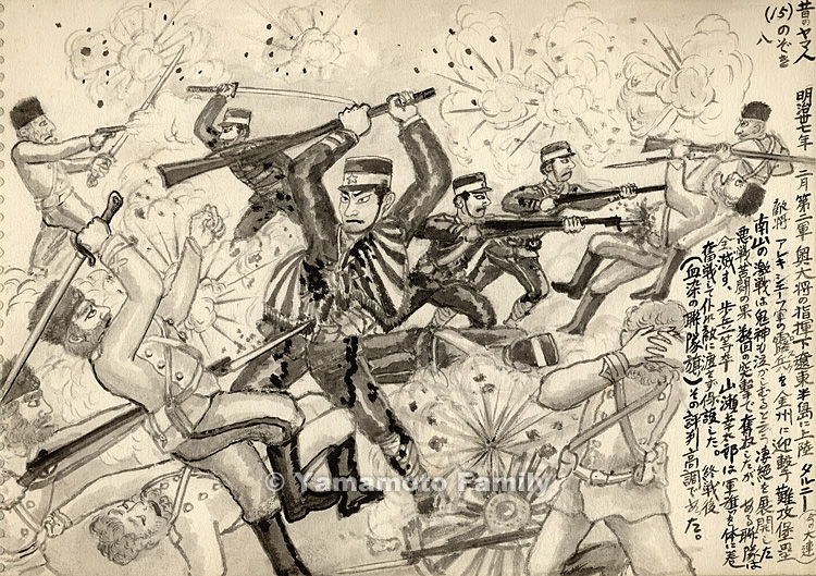 明治丗七年二月、第二軍奥大将の指揮下遼東半島に上陸。タルニー(今の大連)敵将アレキシエーフ軍の露兵を金州に迎撃、難攻堡塁南山の激戦は鬼神も泣かしむると云う凄絶を展開した。悪戦苦闘の果、数回の突撃で奪取したが、ある聯隊は全滅す。歩兵一等卒山瀬幸太郎は軍旗を体に巻、奮戦して仆れ敵に渡さず保護した。終戦後、血染の聯隊旗その評判高調であった。
