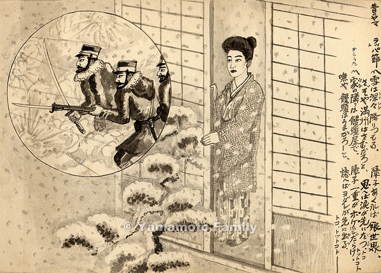 ラッパ節2 ~雪は深々(シンシン)降りつもる。障子あくれば銀世界。さぞや満州はさむかろと、思へば涙が先にたつ(でる) トコトッコトかえうた ~家(ウチ)の隣は饅頭屋で、障子一重がホケ(湯気)だらけ、嘸や饅頭はうまかろーと、憶へばヨダレが先に出る(タツ)。トコトットコトー