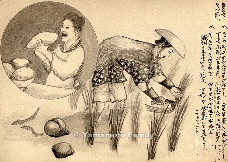 昔のヤマ ラッパ節 ~うちのおっかちゃんは芋が好きー、しかも芋喰うて死んだげなー、丁度今年が三年目、屁のでるたんびに思い出す、トコトットコトー ~た、た、た、た、田の中で、おすそがやつれて水鏡ー、鰌奴たまげていもり込む 田螺ゃ吃驚して蓋をする、トコトットコトー