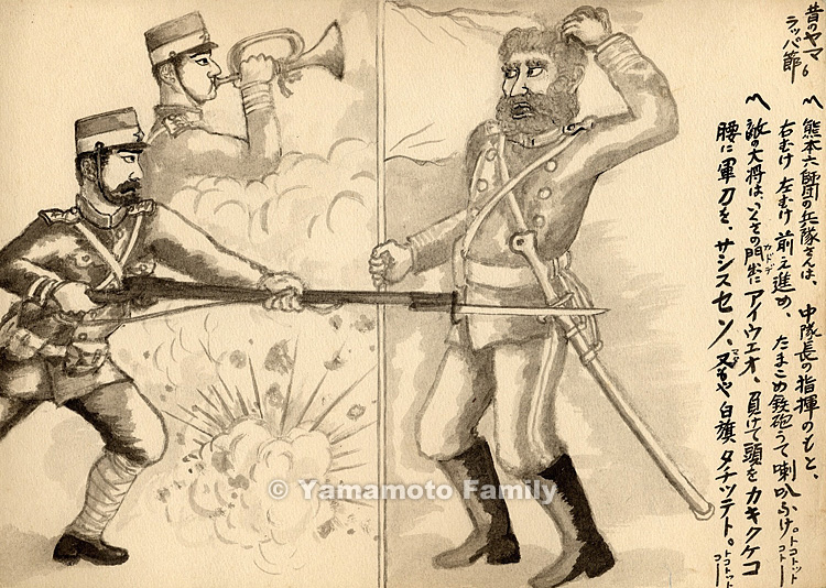 昔のヤマ ラッパ節 ~熊本六師団の兵隊さんは、中隊長の指揮のもと、右むけ左むけ前へ進め、たまこめ鉄砲うて喇叭ふけ、トコトットコトー ~敵の大将はいくさの門出にアイウエオ、負けて頭をカキクケコ、腰に軍刀をサシスセソ、又もや白旗タチツテト、トコトットコトー